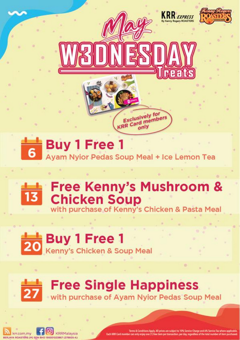 Kenny Rogers Roasters Malaysia is having their May Wednesday Treats Promotion. Calling for all KRR Card members! Mark your calendar for KRR Card Wednesday Treats for May 2020.