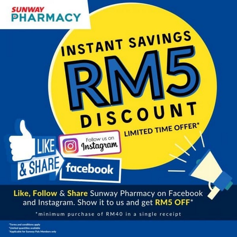 Step 2: Like, Follow & Share Sunway Pharmacy on Facebook and Instagram & show it to the cashier upon payment.