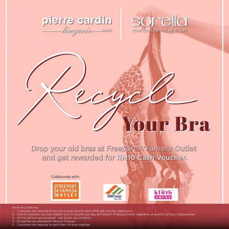 Pierre Cardin Lingerie & Sorella Malaysia is having their Recycle Old Bra Free Voucher Promotion at Freeport A’Famosa. When you’re done with your bras, don’t just throw them away.