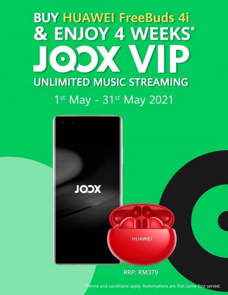 Calling all music lovers! Enjoy complimentary 4-weeks of JOOX Malaysia VIP Unlimited Music Streaming when you purchase a HUAWEI FreeBuds 4i.