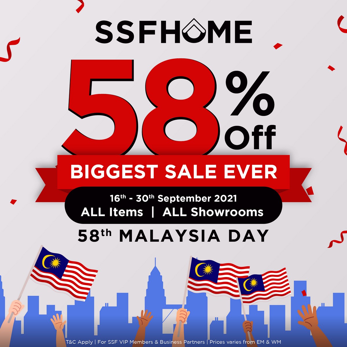SSFHOME wants to unite all Malaysians through this amazing deal, 58% OFF on ALL items at ALL showrooms Nationwide and Online. From 16 – 30 September 2021 only.