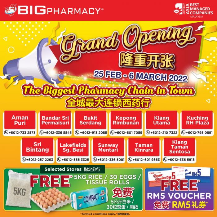 Big Pharmacy Malaysia is having their 11 Stores Opening Promotion. 11 Store! Total 11 Stores Grand Opening and Relaunching in this FEBRUARY 2022.