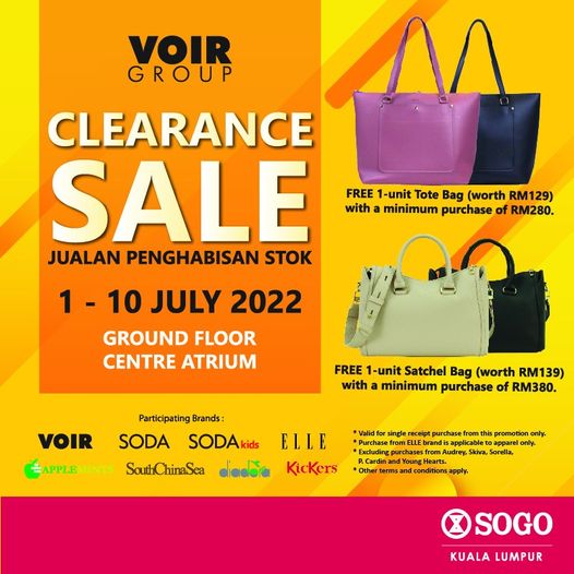 Voir Group Malaysia is having their Clearance Sale at SOGO. Our VOIR GROUP CLEARANCE SALE has a splash of fashionable favourites or mix and match selections to spice up your look, from trendy bags to flexible clothing from participating brands like SODA, ELLE, KICKERS and much more.