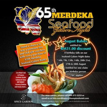 Hompton Hotel Malaysia is having their Seafood Galore Night. In conjunction with 65th Merdeka celebration next month, enjoy RM31.00 discount when your birthday falls on any of our Seafood Galore Night days.