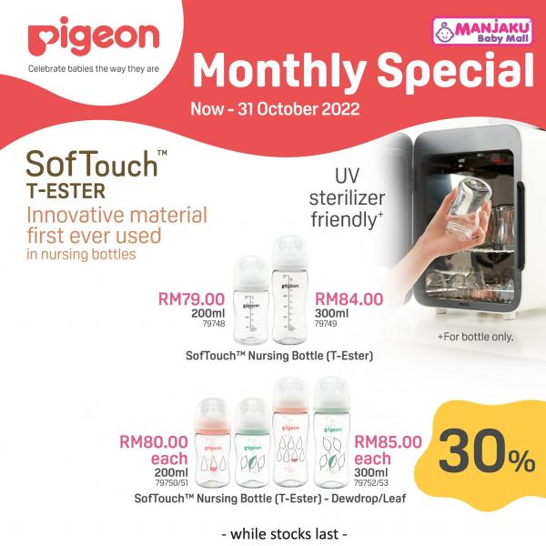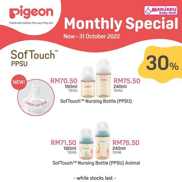 Exclusive Monthly Special Deals at all Manjaku Baby Mall for you. Get 30% of on Pigeon SofTouch PPSU, PP or T-Ester. Limited units and first come first serve.