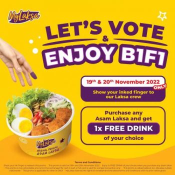 Show your voting finger (with indelible ink) to MyLaksa laksa crew at any MyLaksa outlets nationwide and enjoy Buy 1 Free 1.