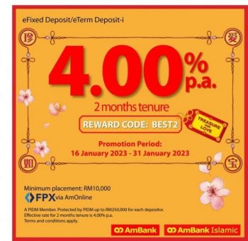 AmBank Malaysia is having their CNY Deals. Get 2 month 4.00% p.a. this CNY for your eFD/eTD-i when you deposit a minimum of RM10,000 via FPX on AmOnline.