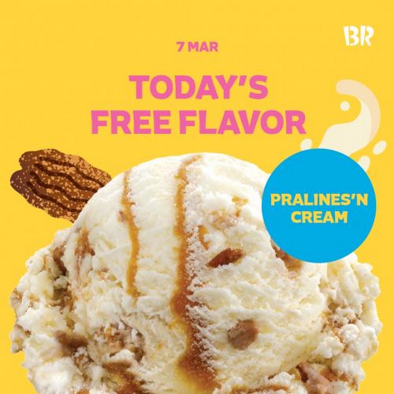 Get today’s flavor of the day, Pralines ‘N Cream Kids Scoop for FREE* when you buy any Single Regular ice cream!