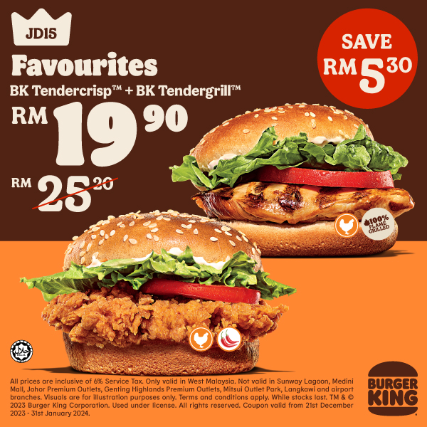 Burger King Malaysia is having their 2 burgers for the price of 1 coupon. Enjoy our 2 burgers for the price of 1 coupon and make your meal twice as delightful.