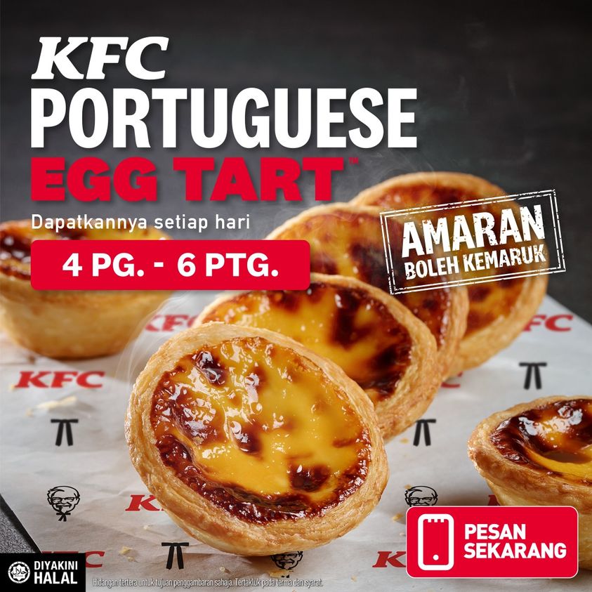 Anyone hungry for KFC Portuguese Egg Tart? Now available 4 am – 6 pm near KFC restaurant and delivery.