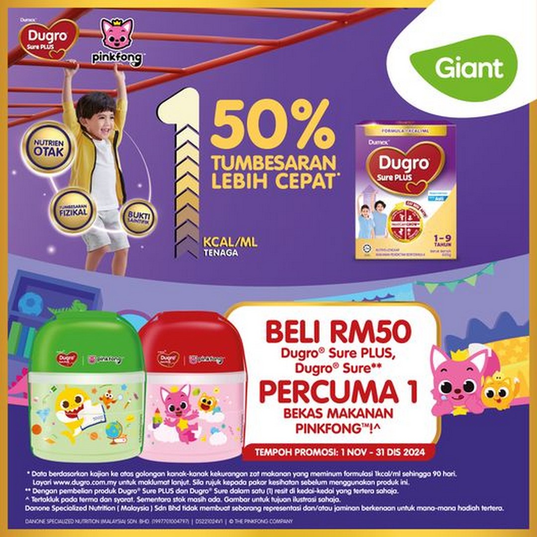 Are you looking for a fantastic deal that provides both nutrition for your child and a fun reward? Look no further than Giant Malaysia’s exciting promotion in partnership with Dugro. This season, Giant Malaysia is offering a limited-edition PINKFONG™ food container for free when you purchase Dugro® Sure PLUS or Dugro® Sure products worth RM50 in a single transaction. Not only does this promotion bring you value for your money, but it’s also a chance to support your child’s growth with high-quality nutrition while adding a unique PINKFONG™ collectible to their mealtime essentials.