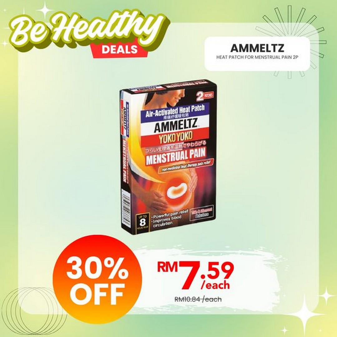 - Heat Patches for pain relief: If you experience discomfort due to muscle pain or menstrual cramps, Ammeltz Yoko Yoko Heat Patches are an excellent choice. With 30% off, you can get them for just RM7.59 each, making it affordable to keep these pain-relieving patches in your wellness kit.