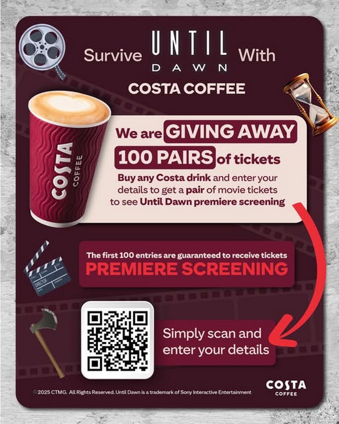 By simply buying one Costa Coffee drink, customers can enter to win a pair of invites to the Until Dawn midnight premiere on 3 May 2025 at GSC Mid Valley. That’s right—just one drink could be your ticket to the ultimate late-night thrill.