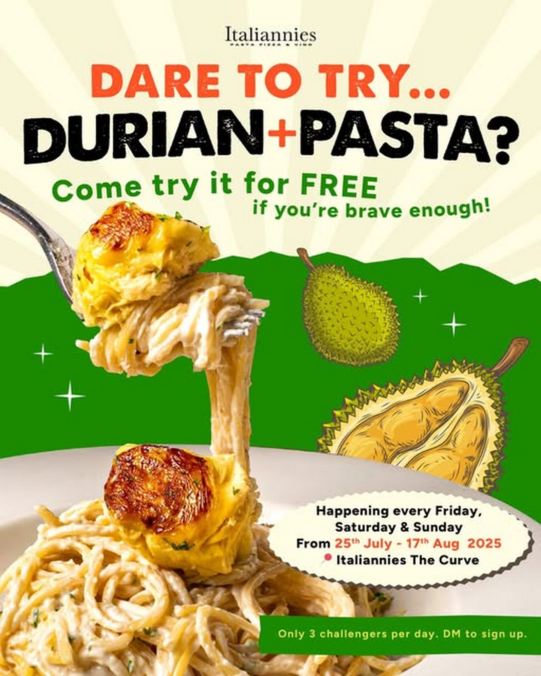 From 25 July to 17 August 2025, every Friday to Sunday, Italiannies at The Curve is inviting thrill-seekers and food lovers to join their Durian Carbonara Challenge. It’s not for the faint of heart, but it might just be the most unusual (and fun) way to score a free pizza or even walk away with a RM50 cash voucher.