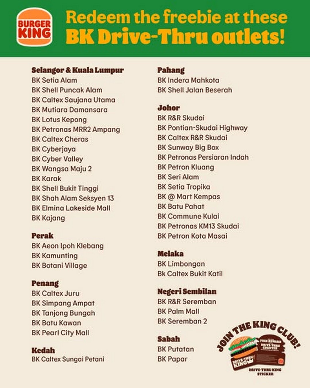This offer is available at a wide selection of Burger King Drive-Thru outlets nationwide, spread across 10 states and regions in Malaysia. Here’s a breakdown of participating locations so customers can plan their meal pitstops accordingly: