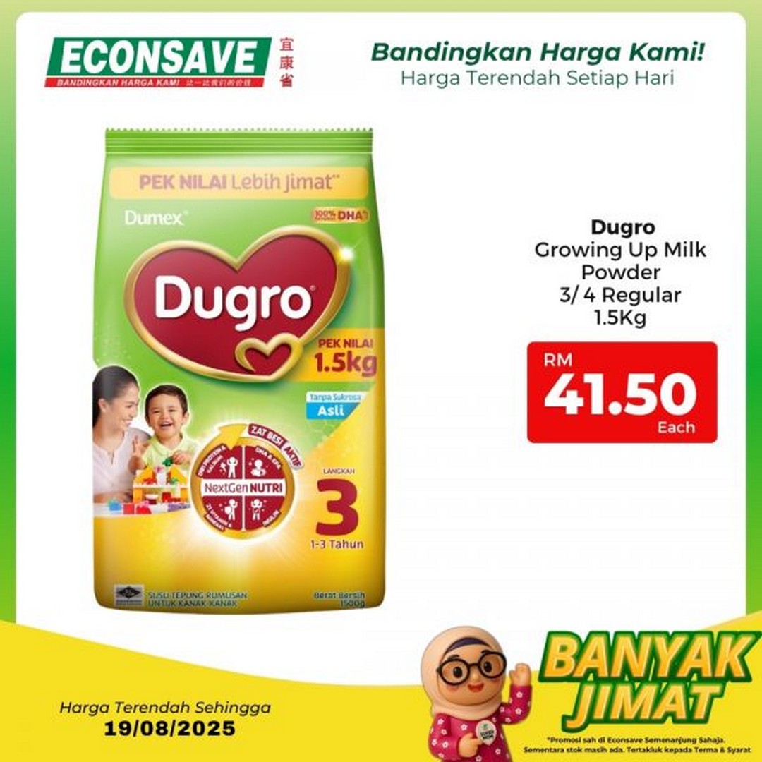 Families with young children will appreciate the reduced price on Dugro Growing Up Milk Powder 3/4 Regular (1.5kg) at RM41.50, helping to ease the financial pressure of providing nutritious milk for toddlers and young kids.