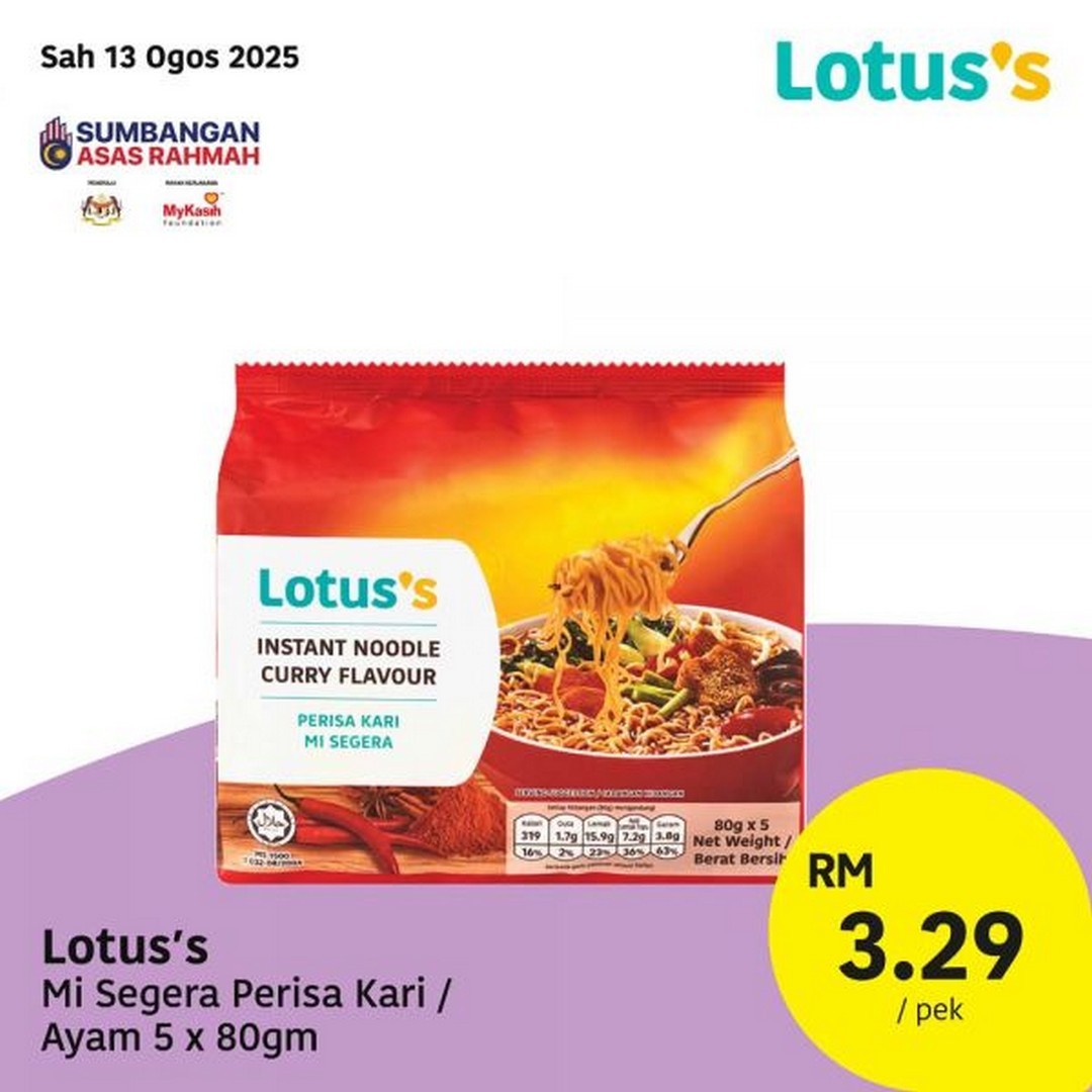 One of the highlights this week is Lotus’s Mi Segera Perisa Kari / Ayam 5 x 80g, available for just RM 3.29 per pack. Instant noodles are a household staple across Malaysia, and this offer allows shoppers to stock up without worrying about the price. Perfect for quick lunches, dinners, or even midnight snacks, these noodles provide convenience while keeping costs low.