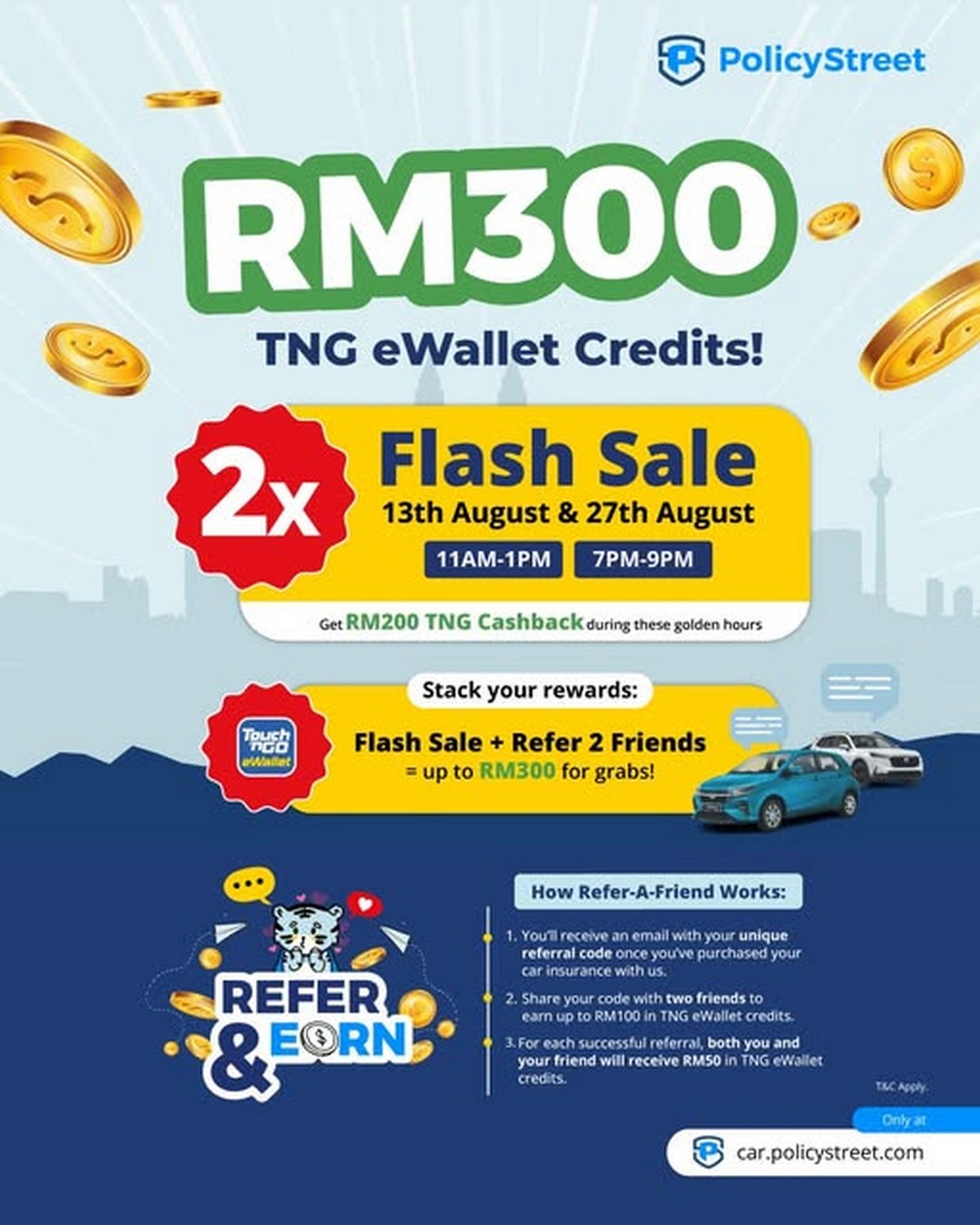 So, what’s the deal exactly? During the Flash Sale, buyers can get RM200 TNG Cashback when purchasing car insurance. The best part is that the Flash Sale isn’t limited to a single time slot. PolicyStreet has carefully planned two daily windows – 11 AM to 1 PM and 7 PM to 9 PM – ensuring that even those with busy schedules have an opportunity to participate. This flexibility makes it much easier for anyone to take part without rushing through their day.