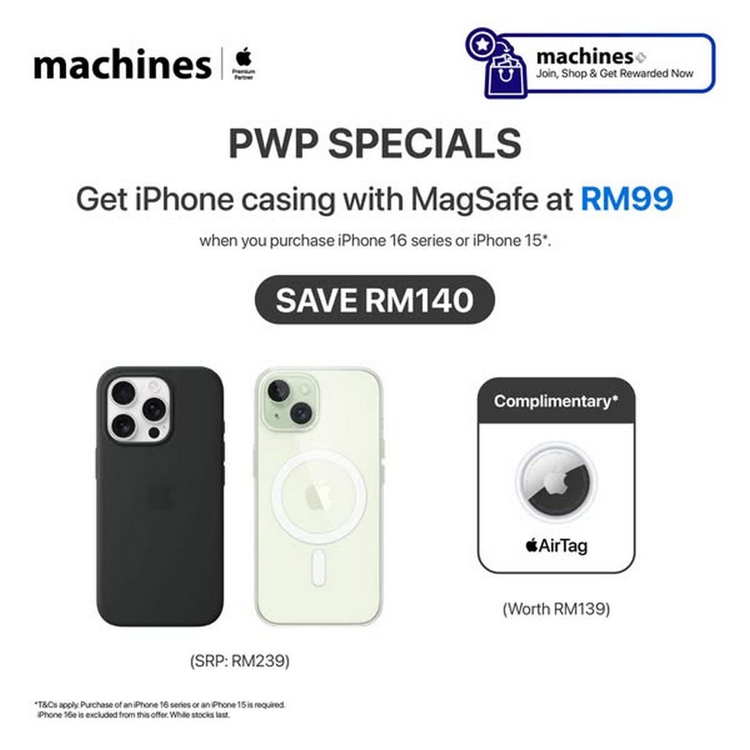 Machines is giving customers a chance to grab either an iPhone Case with MagSafe or a Beats iPhone 16 Case with MagSafe for only RM99 when they purchase an iPhone 16 Pro, iPhone 16, or iPhone 15 (excluding the iPhone 16e). The regular price of these cases is RM239, so buyers are saving a significant amount right at the point of purchase. Considering how most iPhone users want a protective case straight away, this promotion feels like a practical and timely bonus. Instead of spending extra later, buyers can walk out of the store with their new device already protected at an unbeatable price.