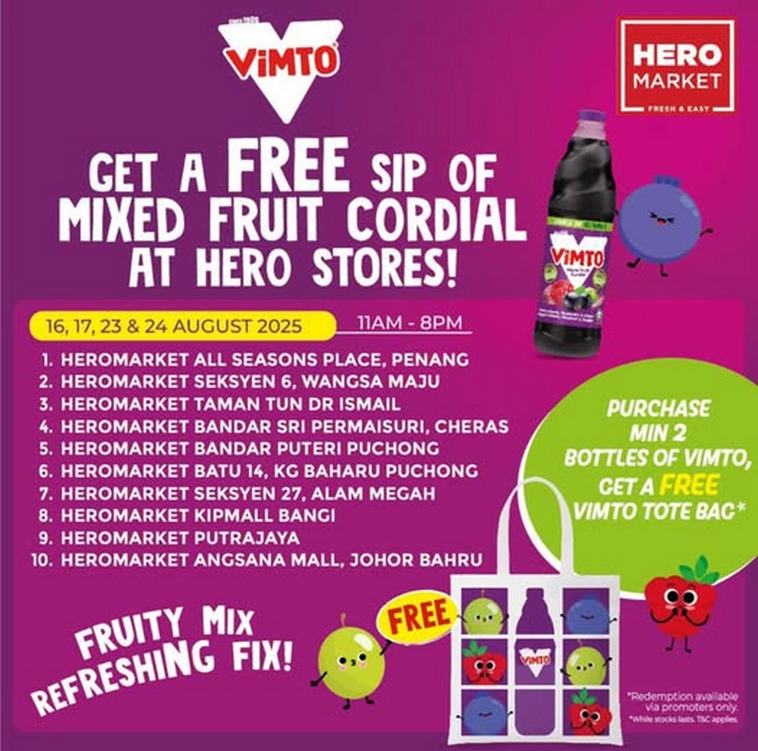 If you are looking for a simple, enjoyable, and cost-free way to add a little brightness to your shopping routine, this promotion is an excellent choice. Mark your calendars, plan your visit to the nearest participating HeroMarket branch, and get ready to savour the fruity freshness of Vimto. It’s a straightforward, rewarding, and enjoyable experience that adds a splash of fun to your day while keeping things light on the wallet.