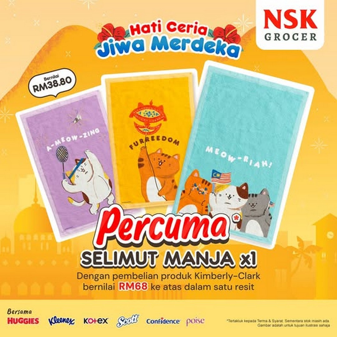 In summary, this NSK Grocer promotion combines practicality, festive spirit, and a sense of exclusivity. Shoppers can enjoy their regular Kimberly-Clark products while receiving a free, Merdeka-themed blanket that enhances the celebratory atmosphere at home. With the promotion available at key outlets and only while stocks last, it’s an opportunity that shouldn’t be missed. Mark your calendar, head to NSK Grocer, and bring home a piece of the Merdeka spirit this season.