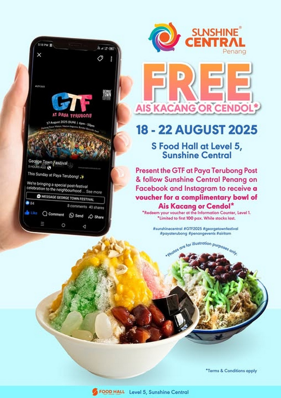 Sunshine Central in Penang is turning the post-festival vibes into something extra sweet this August! After the excitement of the George Town Festival at Paya Terubong, Sunshine Central is inviting everyone to celebrate with a refreshing treat. From 18 to 22 August 2025, shoppers and food lovers alike can enjoy a free bowl of Ais Kacang or Cendol at their popular S Food Hall on Level 5.