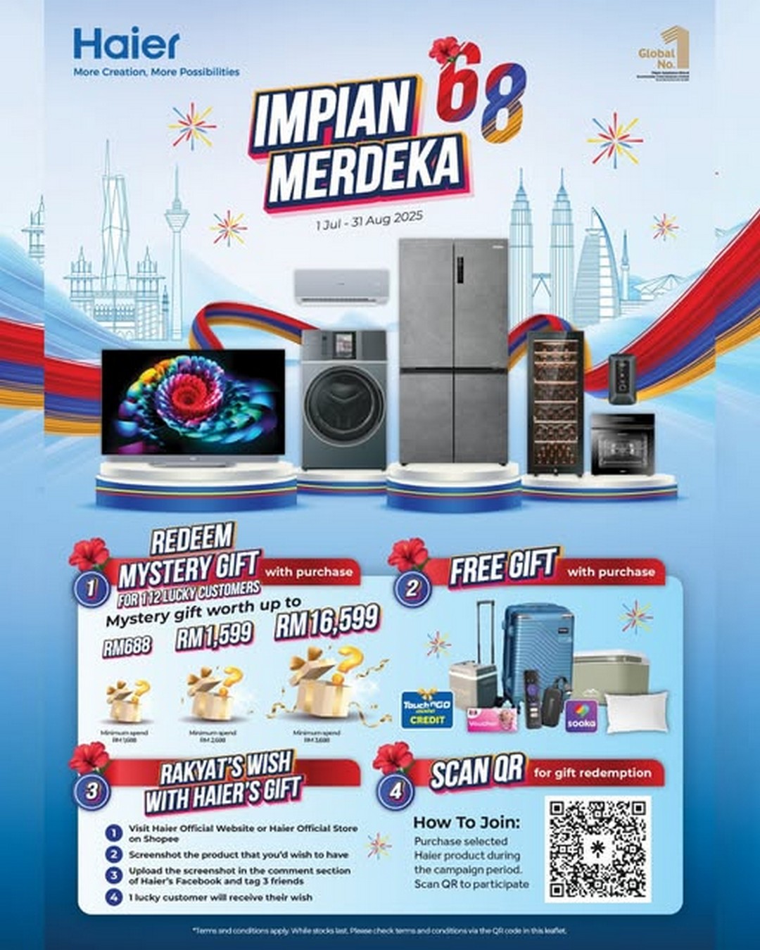 The concept is simple yet effective. When shoppers purchase a Haier product during the Impian Merdeka 68 Sale, they are automatically eligible for these exclusive perks. Whether it’s a brand-new refrigerator to keep your groceries fresh or a washing machine to make laundry less of a chore, the added value of free gifts and mystery prizes turns a regular purchase into an experience. For families looking to upgrade their appliances, this is the perfect time to invest in quality products without stretching their budget too far.
