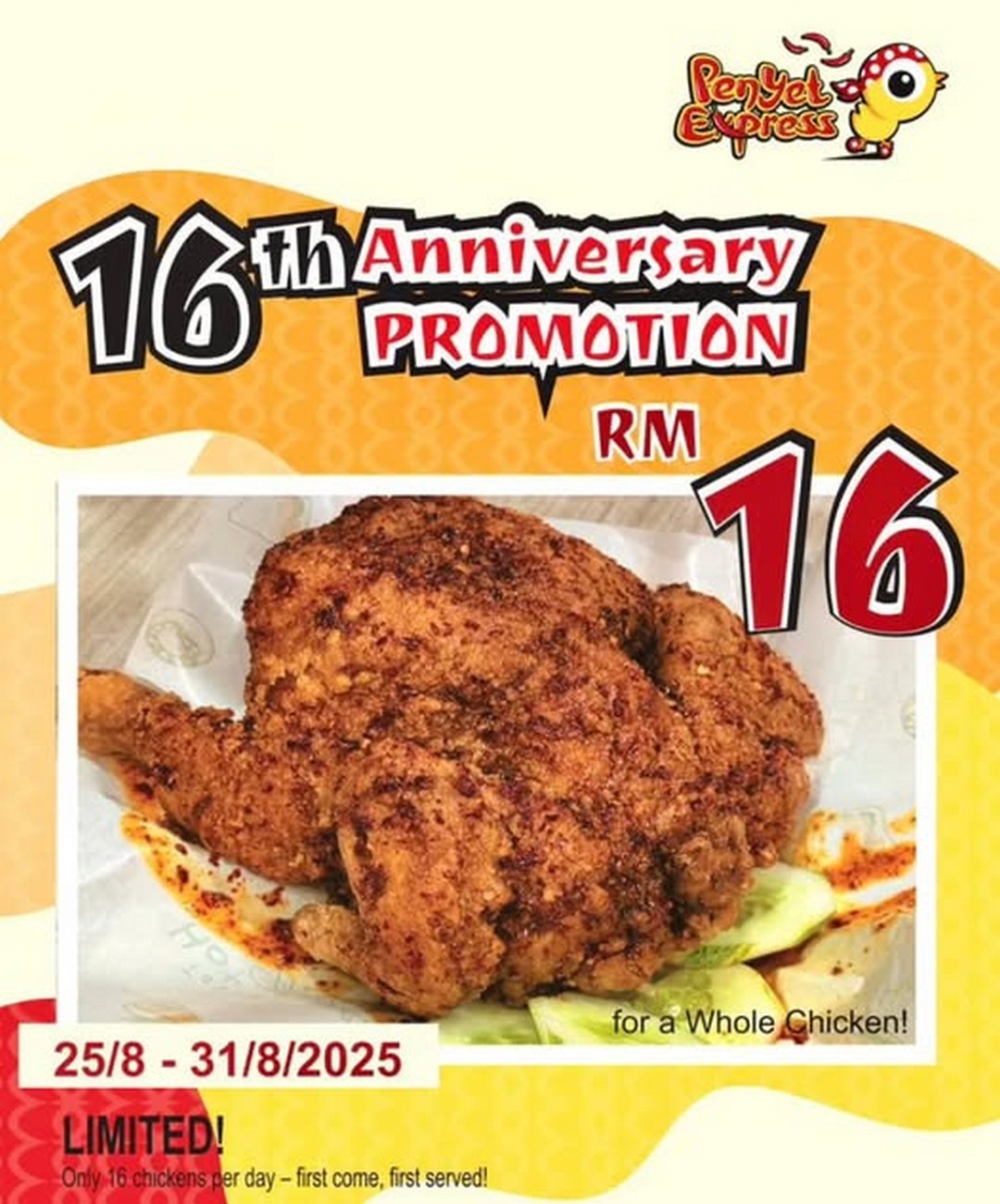 Celebrating anniversaries with discounts is not uncommon, but Penyet Express has gone a step further by tying the price to the number 16 – symbolic of their 16 years in the business. Offering a whole chicken at RM16 is already a massive bargain compared to regular dining prices, but the RM1 chicken makes it an unbeatable deal, albeit extremely limited.