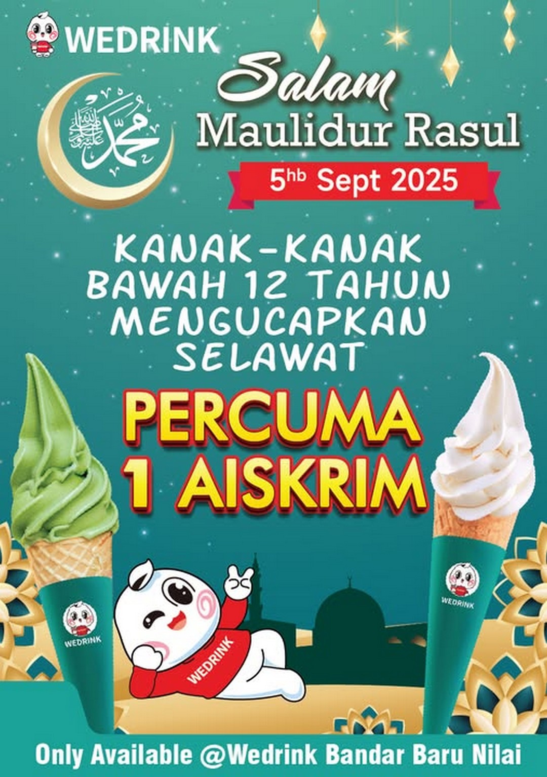 This year, WEDRINK Malaysia is offering an exclusive Maulidur Rasul promotion that is perfect for families. On 5 September 2025, children below 12 years old who recite Selawat at the counter will be rewarded with a free ice cream. It’s a simple but delightful way to encourage children to participate in this meaningful tradition while enjoying a sweet treat. The promotion is not only about free ice cream—it’s a way to introduce young ones to the spirit of giving and celebration associated with this special day.