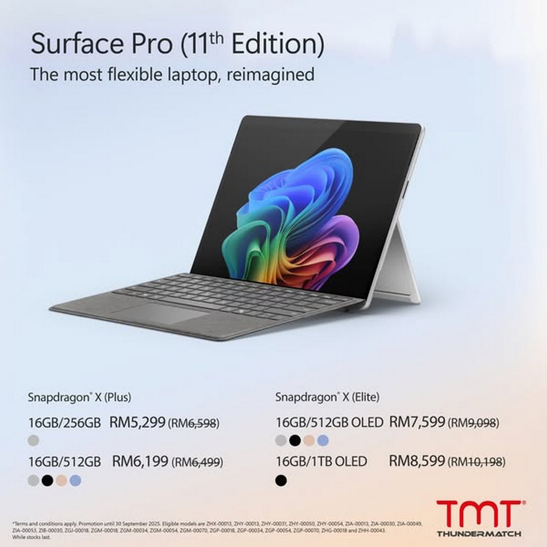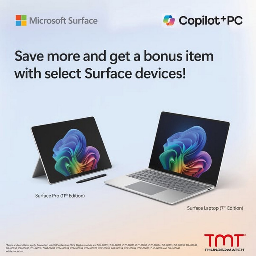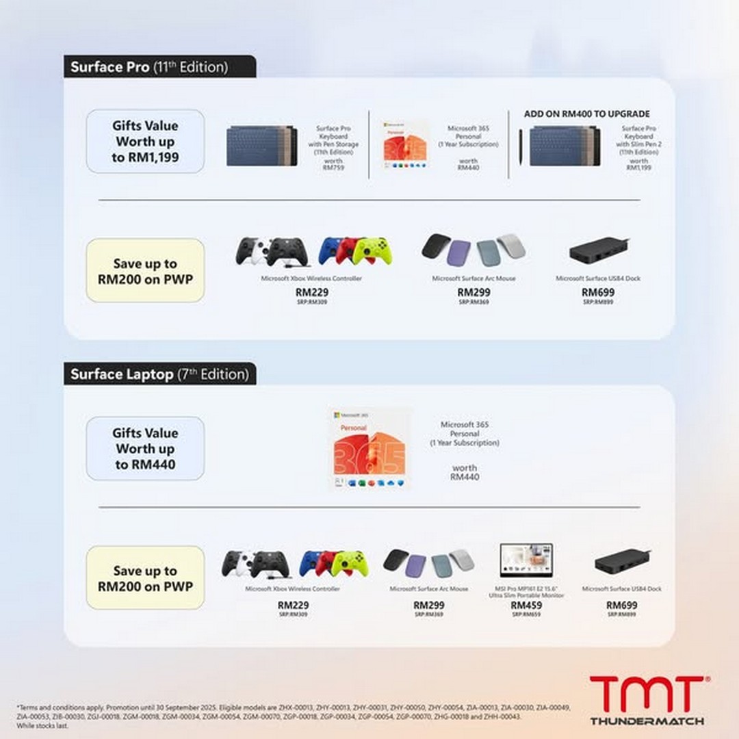 If you’ve been considering an upgrade to a new laptop or tablet, this might be the perfect time to do so. TMT Malaysia is currently running a sale on selected Microsoft Surface devices, where buyers can save up to RM2,140. On top of these generous discounts, there are also free gifts worth up to RM1,199 and additional purchase-with-purchase (PWP) offers where you can enjoy up to RM200 off selected items. This promotion is available both at TMT’s retail outlets across Malaysia and online, making it easy for shoppers to take advantage of the deal. The sale runs until 30 September 2025, giving people a limited but valuable window to secure one of the best offers on Surface devices this year.