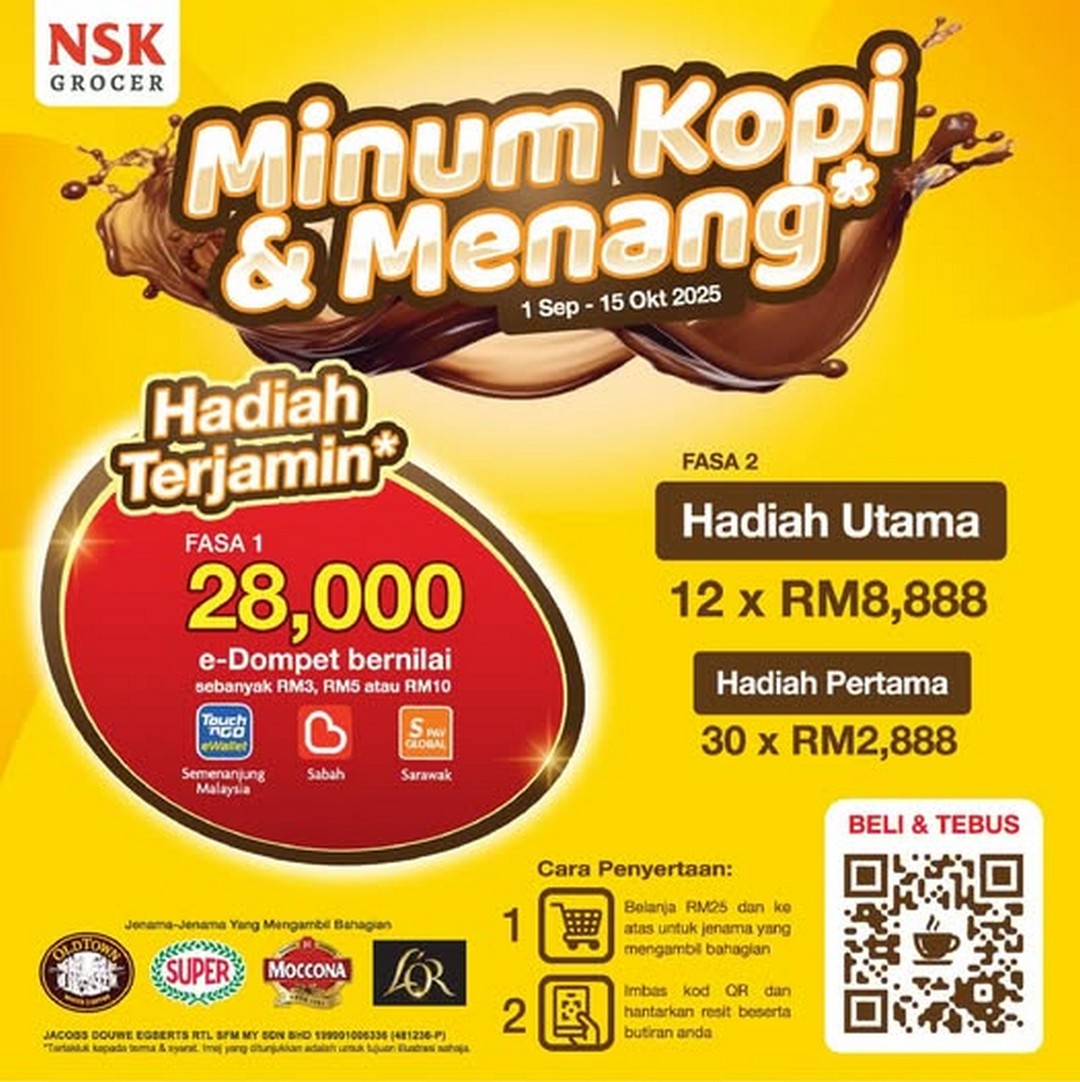 The mechanics are simple, which is what makes this campaign so appealing. Between 1 September and 15 October 2025, shoppers who spend a minimum of RM25 on participating coffee brands at any NSK Grocer branch stand a chance to enjoy both guaranteed and major rewards.