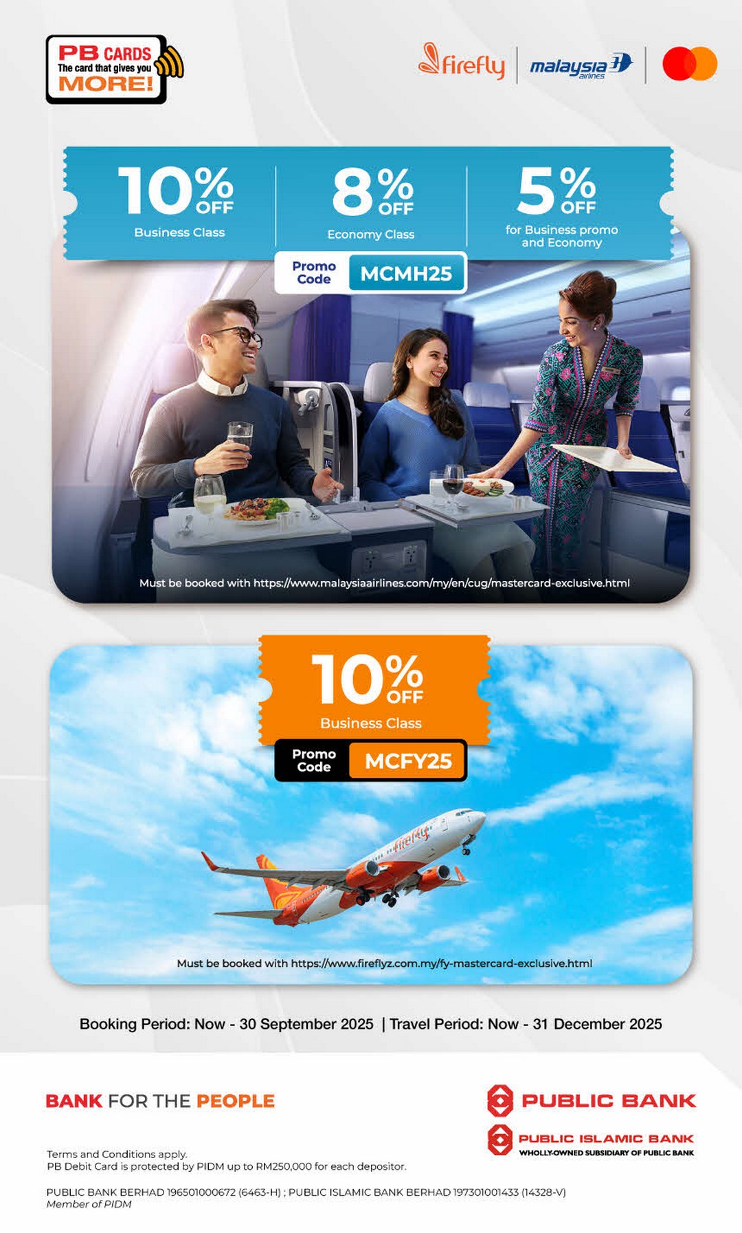Travel is often seen as an investment in memories, experiences, and opportunities. With this Malaysia Airlines and Firefly Airlines Mastercard promotion through Public Bank, travellers now have the chance to enjoy premium services at more affordable prices. Whether it is for business or leisure, short-haul or long-haul, this is one of those deals that makes sense to grab before it ends.