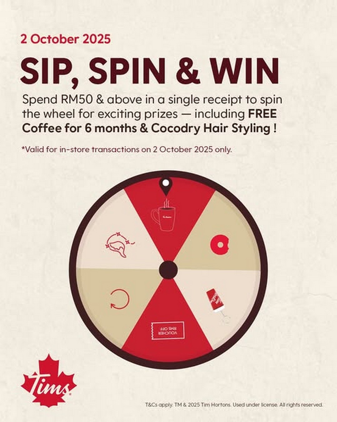 But the excitement doesn’t stop there. Tim Hortons is also offering a thrilling opportunity for visitors who spend RM50 and above. Customers get the chance to spin the prize wheel for a shot at winning FREE COFFEE FOR SIX MONTHS or a FREE Cocodry Hair Styling session. These prizes are ideal for coffee enthusiasts and those looking for a little pampering, making the opening event a unique blend of indulgence and fun.