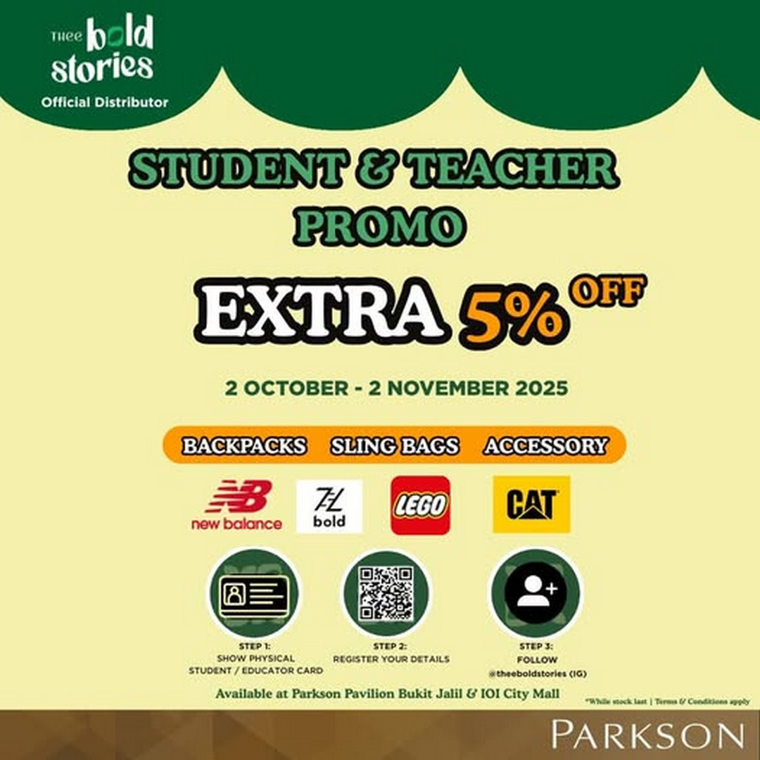 For students gearing up for the new academic year and teachers preparing for the upcoming term, Parkson Malaysia has a fantastic reason to step into their stores. From 2 October to 2 November 2025, students and educators can enjoy an extra 5% off on selected backpacks, sling bags, and accessories from popular brands including New Balance, CAT, LEGO, and BOLD. This is the perfect opportunity to get stylish and practical essentials at even better prices.