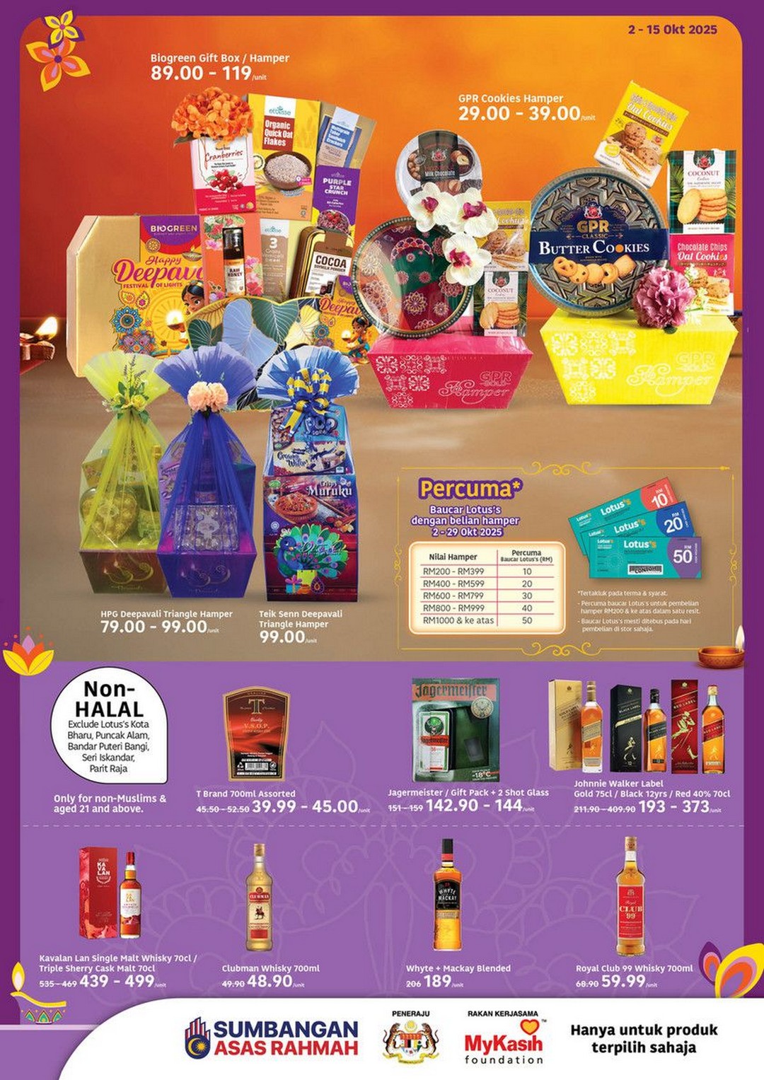 With festive celebrations around the corner, Lotus’s has also put together an exciting selection of festive hampers and gift sets. Biogreen Gift Boxes range from RM89 to RM119, GPR Cookies Hampers are RM29–RM39, and HPG Deepavali Triangle Hampers are RM79–RM99. These options make it easier to send thoughtful gifts or prepare for festive gatherings without breaking the bank.