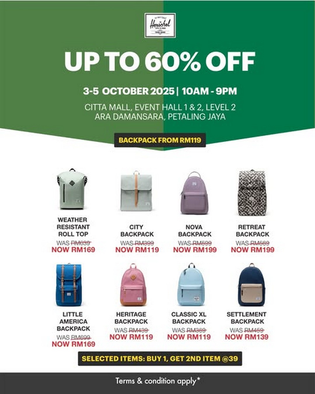 Starting with Herschel, their popular backpack range is available for up to 60% off. For instance, the Weather Resistant Roll Top was originally priced at RM399 but is now marked down to RM169. Classic favourites like the City Backpack are reduced from RM399 to just RM119, and the NOVA Backpack, which used to retail for RM599, can now be yours for only RM199. They’re also offering buy-one-get-second-item deals on selected items, so savvy shoppers can double up on style for less. Herschel’s reputation for durable, versatile backpacks makes this a must-visit for anyone looking to invest in high-quality bags without paying the full price.