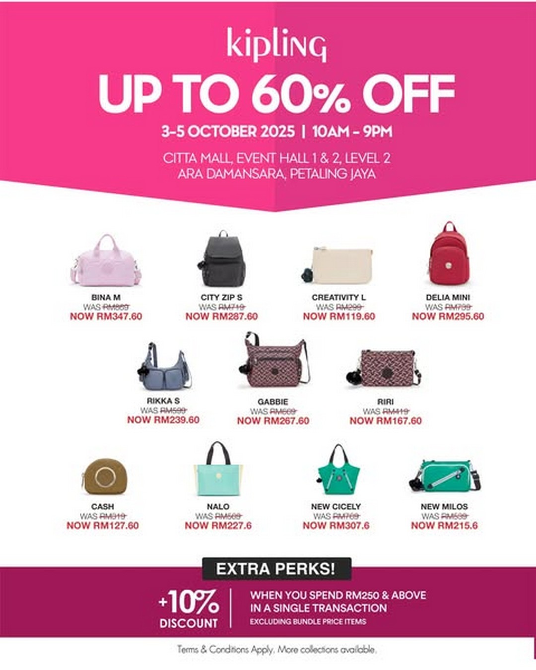 Kipling, another standout brand at the sale, is presenting discounts of up to 60% across a variety of handbags and backpacks. Bestsellers like the Creativity L are slashed from RM299 to RM119.60, while the Rikka S goes from RM599 to RM239.60. Kipling’s playful yet functional designs are ideal for those who want a mix of style and convenience, making it perfect for work, school, or travel. Shoppers who spend RM250 or more in a single transaction can enjoy an additional 10% off, giving them even more reason to load up their carts.