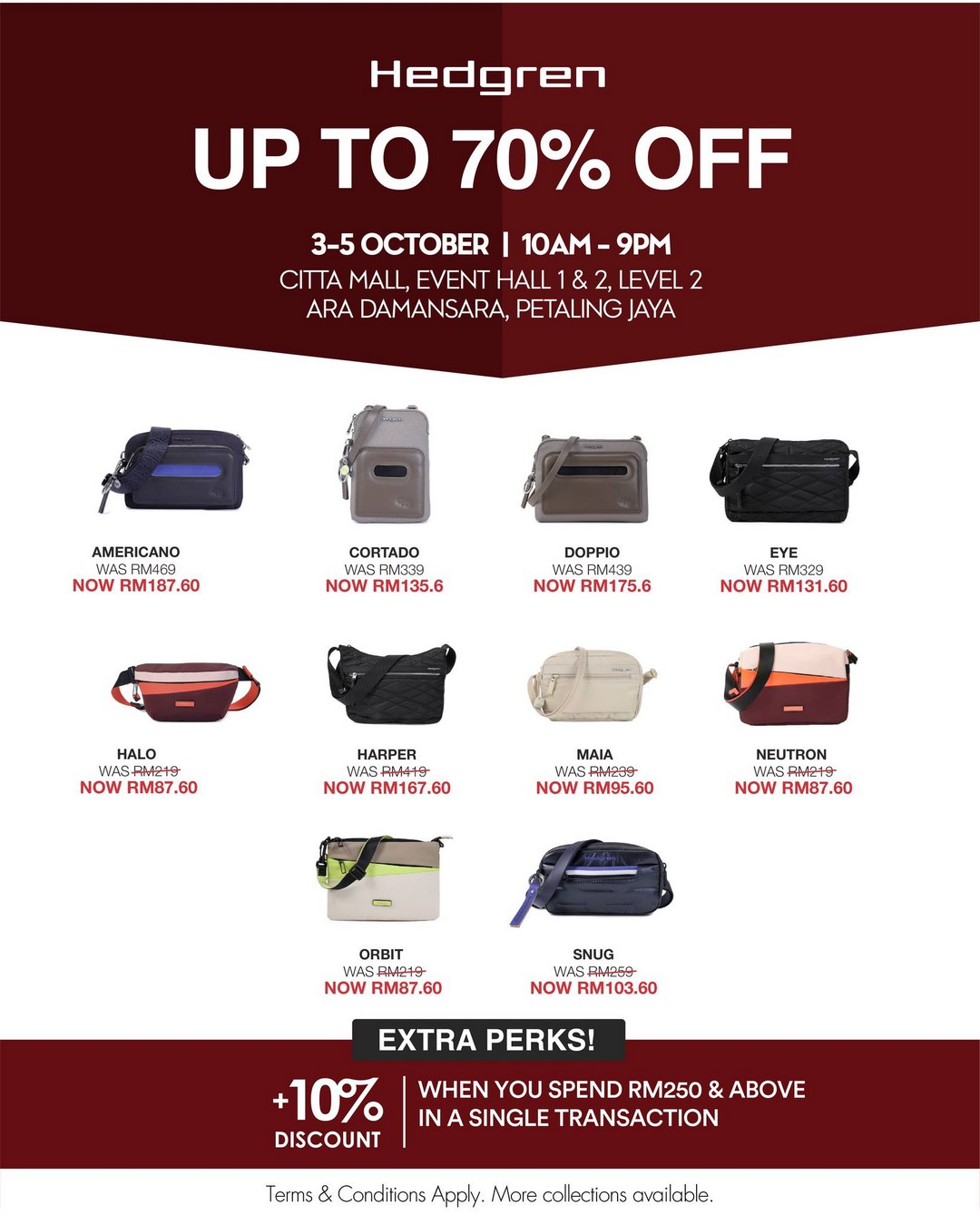 Hedgren is offering up to 70% off, making this a compelling stop for shoppers in need of functional bags and backpacks. Models such as the Americano and Doppio have seen price reductions from RM469 and RM439 down to RM187.60 and RM175.60 respectively. Their designs blend durability, organization, and modern style, ideal for professionals, students, or travellers. With an extra 10% discount for purchases over RM250, Hedgren becomes an irresistible choice for those looking to invest in quality bags without spending a fortune.