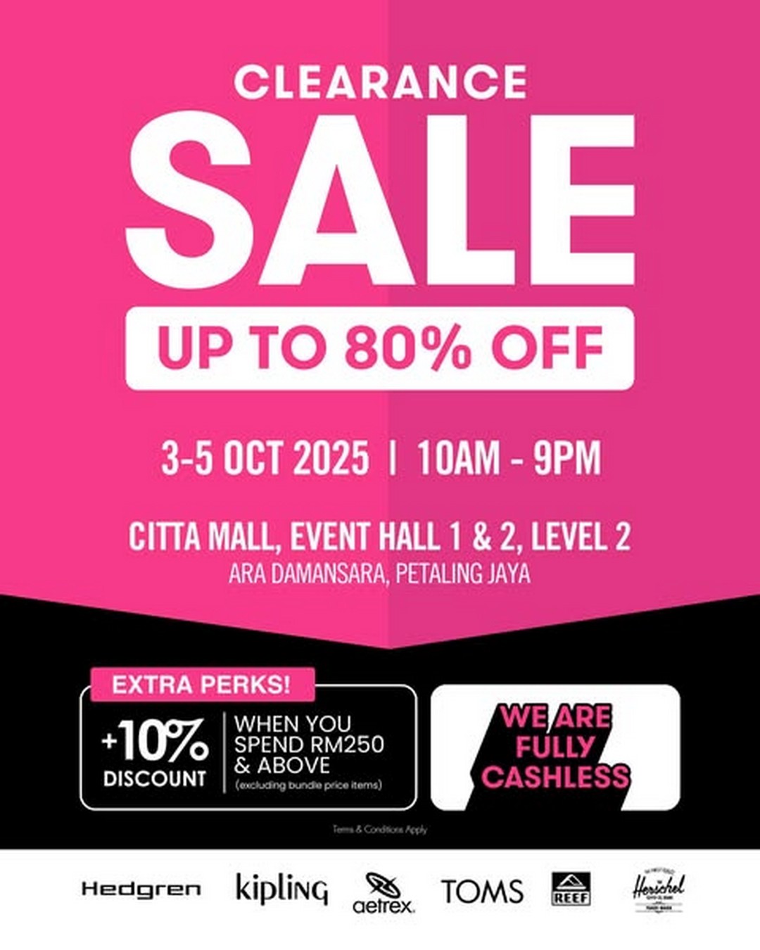 In summary, the Bratpack Malaysia Clearance Sale from 3rd to 5th October 2025 at Citta Mall, Ara Damansara, PJ, is a shopping experience that combines style, savings, and convenience. The extensive brand lineup, deep discounts, additional perks, and fully cashless environment make it a can’t-miss event for anyone keen to elevate their wardrobe without stretching their budget. This is more than just a sale; it’s a chance to explore, enjoy, and upgrade their collection of lifestyle essentials.