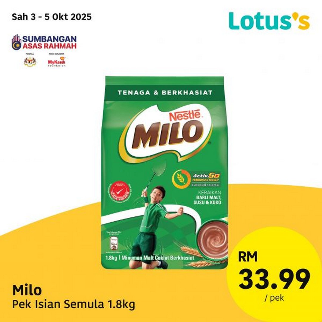 3 – 5 October 2025: Milo Refill Pack 1.8kg – RM33.99/pack – Lotus’s Malaysia