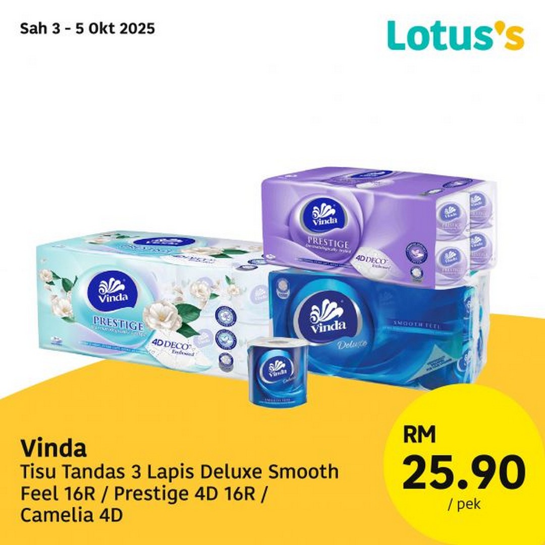 3 – 5 October 2025: Vinda Deluxe/Prestige Toilet Tissue 16 rolls – RM25.90/pack – Lotus’s Malaysia