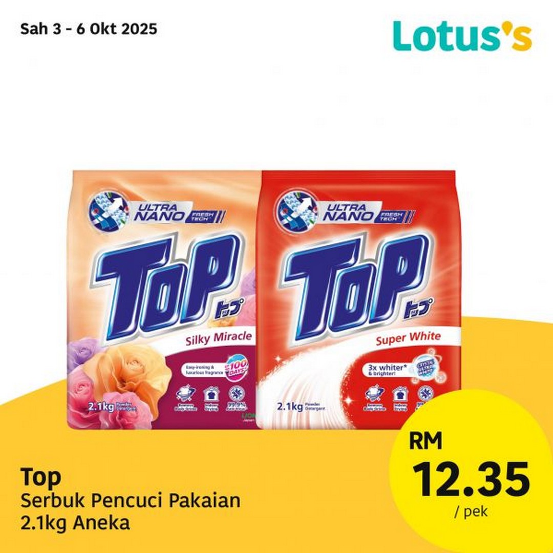 3 – 6 October 2025: Top Powder Detergent 2.1kg – RM12.35/pack – Lotus’s Malaysia