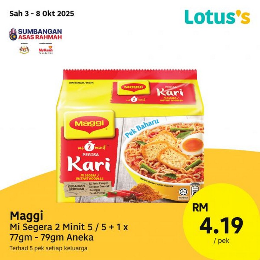 3 – 8 October 2025: Maggi Mi Segera Kari 5+1 (77g–79g) – RM4.19/pack, limit 5 packs per family – Lotus’s Malaysia