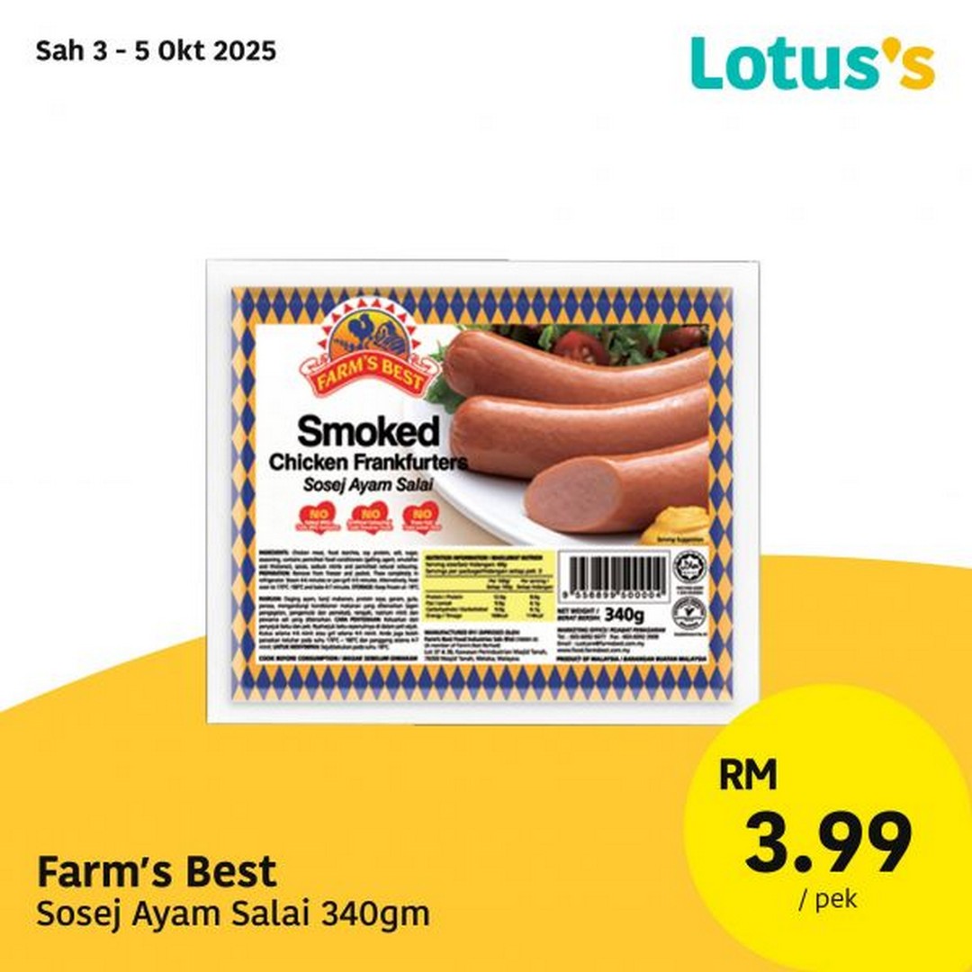 3 – 5 October 2025: Farm’s Best Smoked Chicken Frankfurters 340g – RM3.99/pack – Lotus’s Malaysia