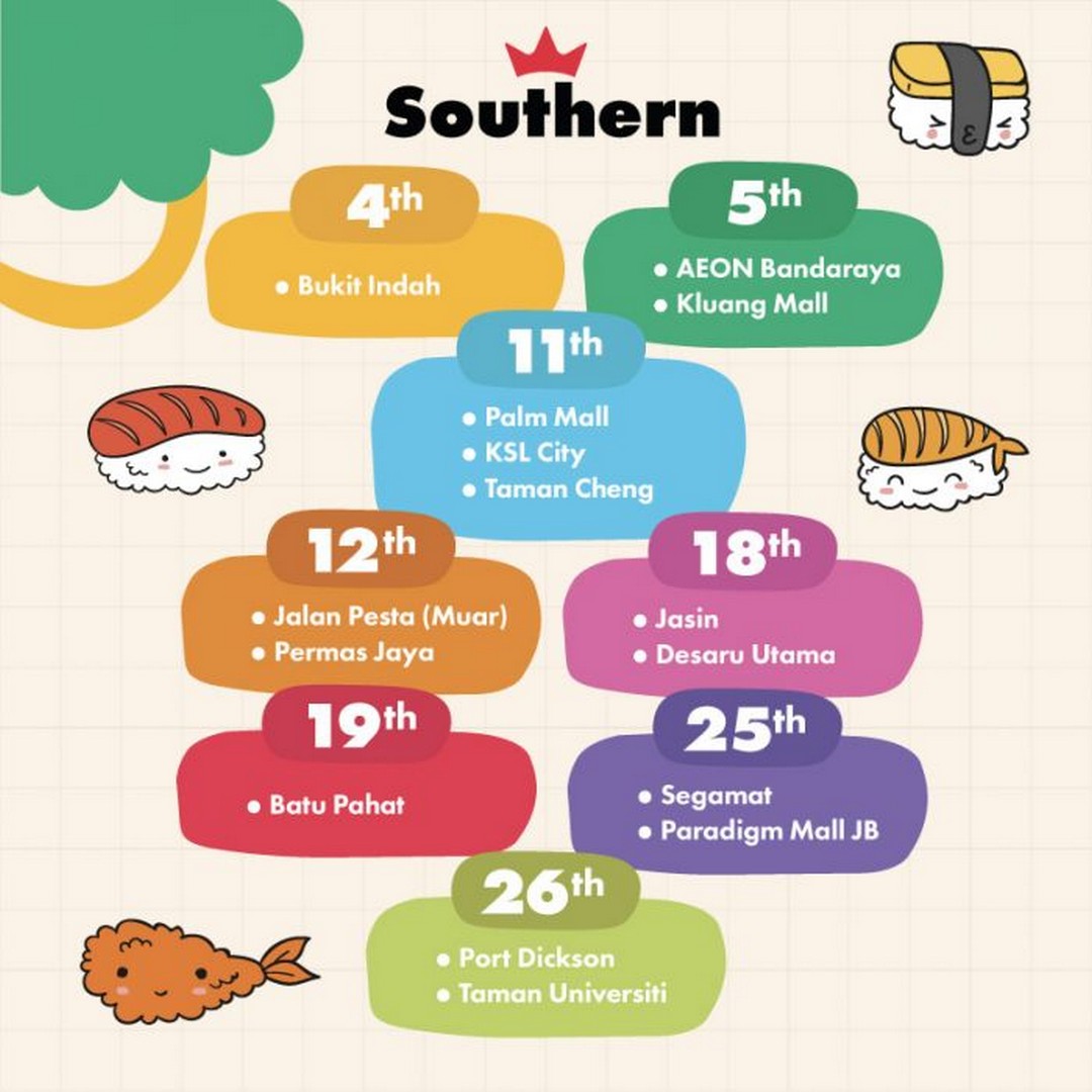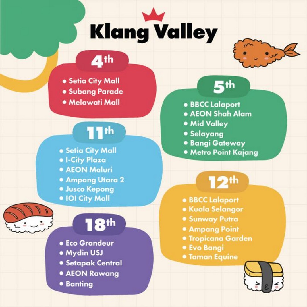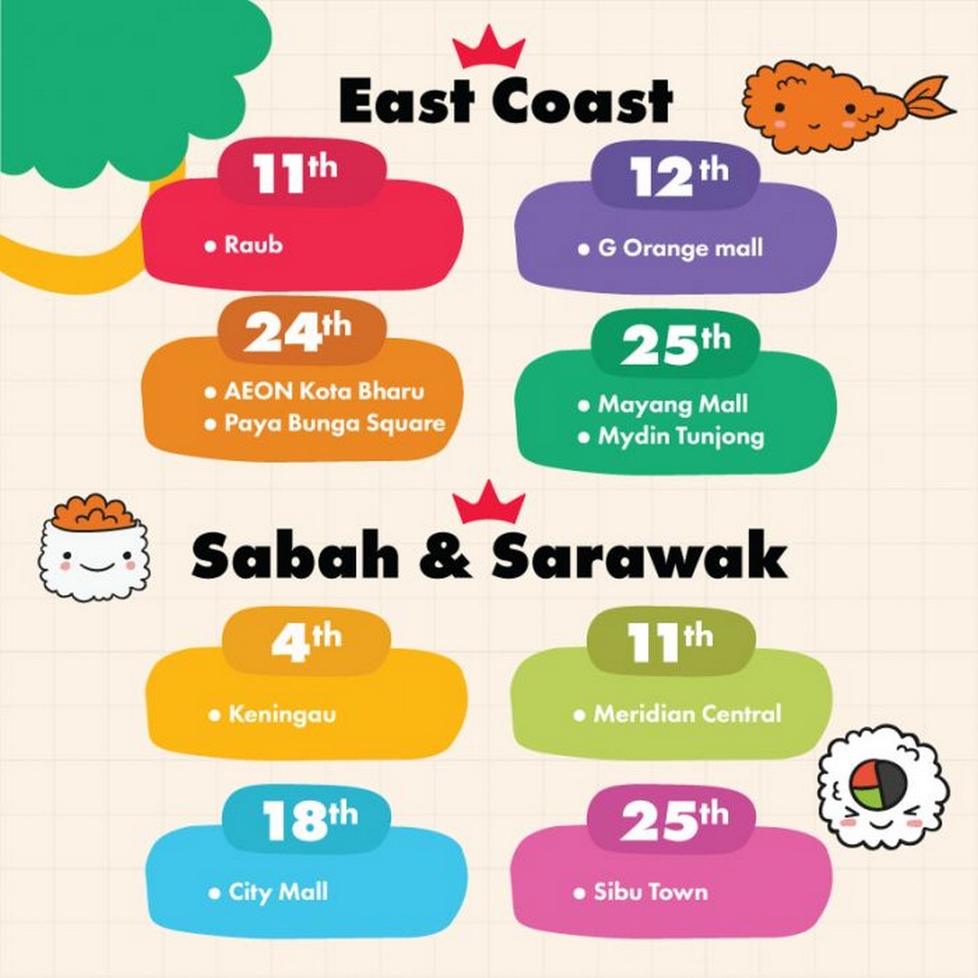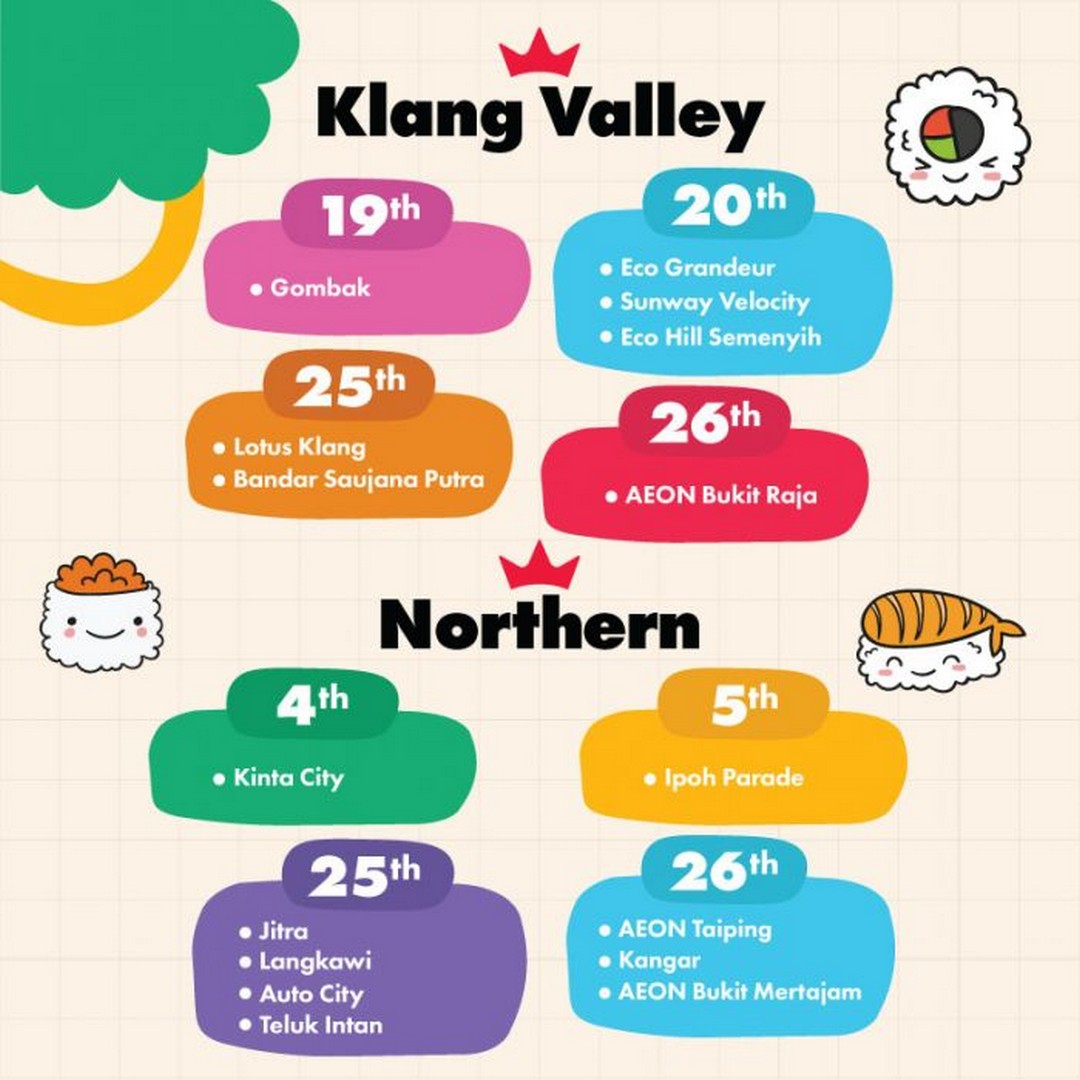 The Sushi Making Class for Kids will take place across numerous Sushi King outlets in Malaysia, covering a wide range of locations from Klang Valley to Sabah and Sarawak. Here’s a detailed look at the locations and dates:
