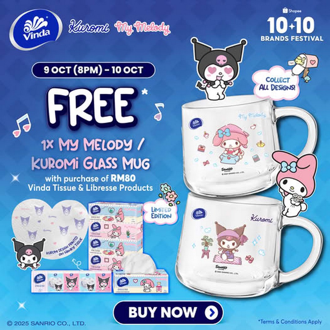 When it comes to finding everyday bargains, nothing beats a promotion that not only helps people save on essentials but also rewards them with something extra. This October, Vinda Tissue Malaysia is teaming up with Libresse to bring a delightful little treat to shoppers. On 9–10 October 2025, for just two days only, customers who spend RM80 on Vinda Tissue and Libresse products will get to redeem a free Kuromi or My Melody glass mug. The redemption begins at 8PM, so those who have a soft spot for Sanrio collectibles will want to mark their calendars and be ready.