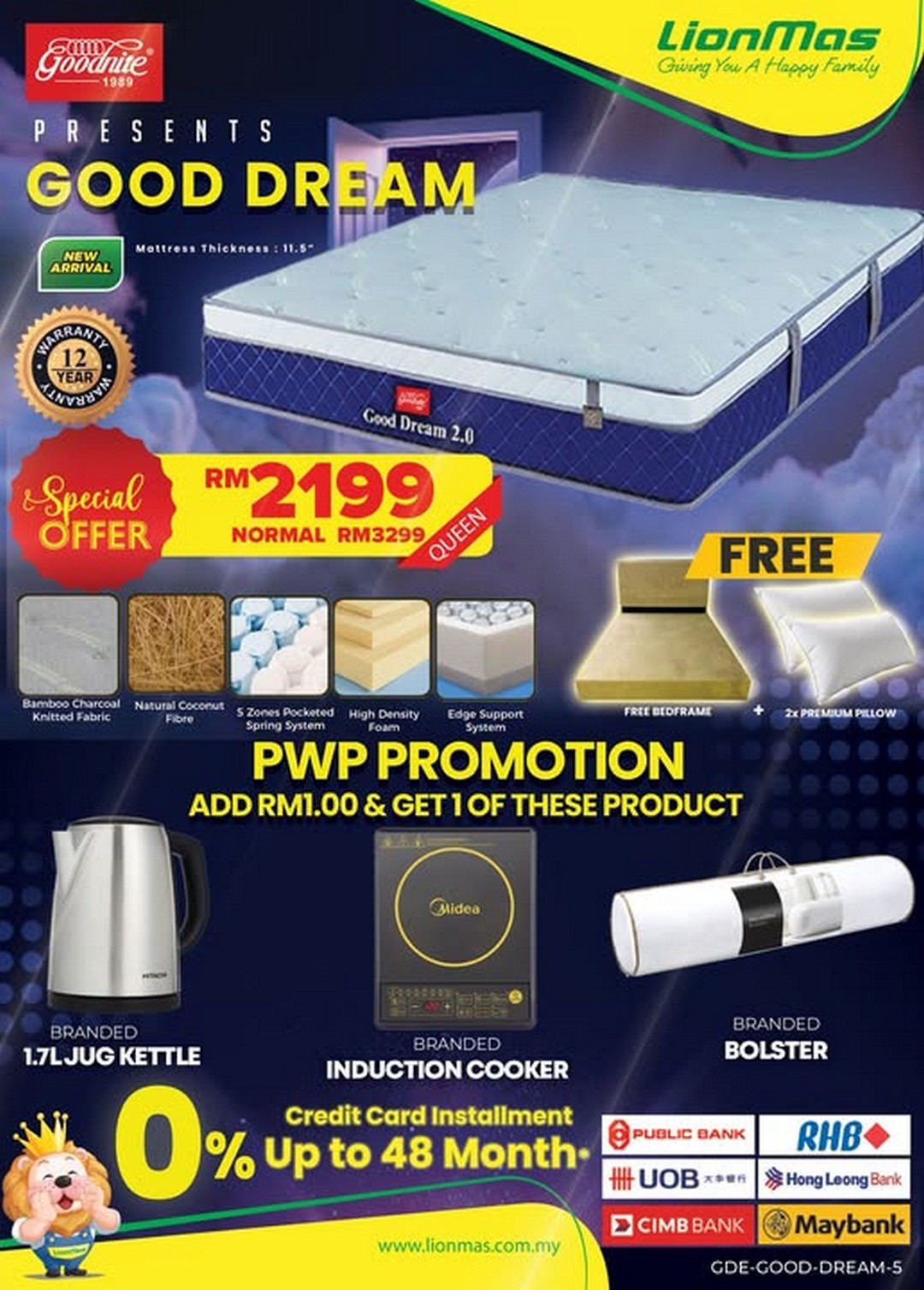 In conclusion, Lionmas Furnishers HQ’s Goodnite Good Dream Mattress promotion is an unmissable opportunity for anyone looking to enhance their sleep experience while enjoying excellent savings. With a heavily discounted mattress, a free bedframe, two premium pillows, optional PWP gifts for just RM1, and 0% instalment plans, this deal combines value, practicality, and convenience. Coupled with Lionmas’s reputation for quality and the ease of finding a nearby store, customers are encouraged to act swiftly before stocks run out.