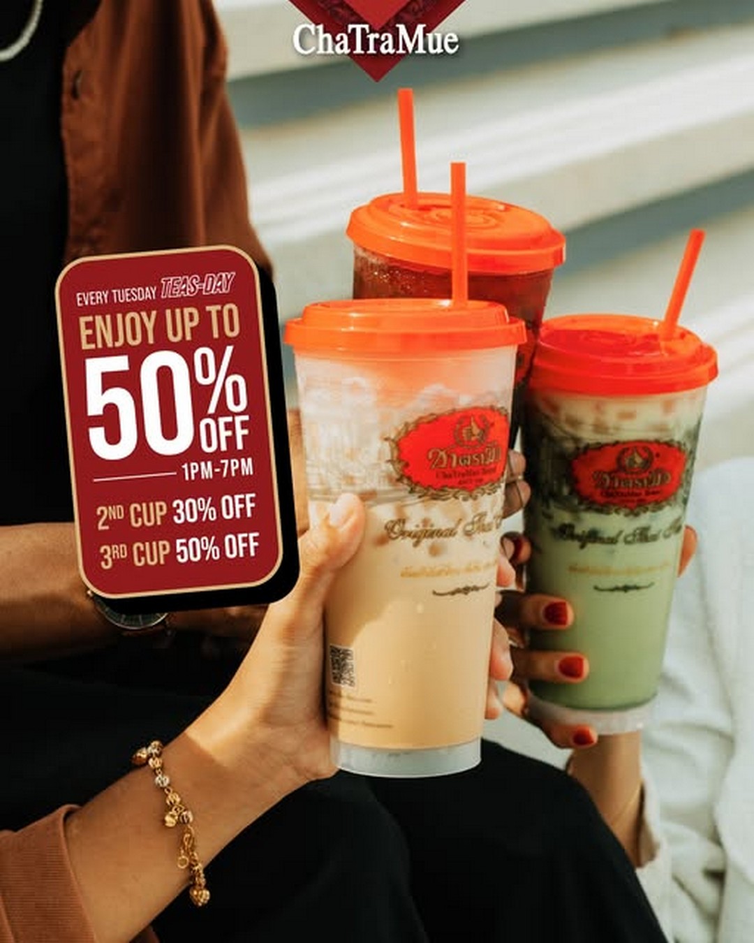 Imagine this: you’re halfway through your workday, the afternoon slump is setting in, and all you need is something refreshing to perk you up. Now, picture yourself walking into ChaTraMue and ordering that creamy Thai Milk Tea you love. With the Teasday promotion, you can grab an extra one for a friend (or yourself) at 30% off, and another at 50% off. It’s indulgence made affordable.