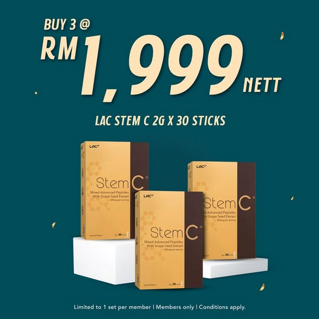 Another highlight is the LAC Stem C promotion, where shoppers can buy 3 LAC Stem C for just RM1,999 nett. This premium formulation is one of LAC’s most popular products, known for supporting skin rejuvenation and overall wellness. Usually, Stem C comes at a higher price due to its high-quality ingredients, but this bundle deal is a solid opportunity for regular users to restock at a lower cost, or for new customers to finally give it a try.