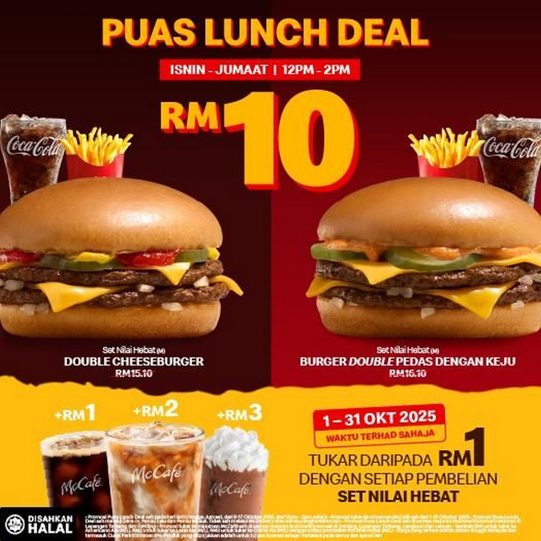 In conclusion, anyone looking for a satisfying lunch that is affordable, convenient, and flavourful should not miss the RM10 Puas Lunch Deal. From the classic Double Cheeseburger to the spicy Burger Double Pedas dengan Keju, each set delivers excellent value with fries and a drink included. The added option to upgrade to McCafé beverages enhances the experience, giving diners the freedom to personalise their lunch. With a limited promotion period, weekday availability, and widespread accessibility at participating McDonald’s outlets and Drive-Thru locations, it’s the perfect chance to enjoy a filling meal without overspending. Head to their nearest outlet from 6 to 17 October 2025, between 12 PM and 2 PM, and experience the RM10 Puas Lunch Deal for themselves.